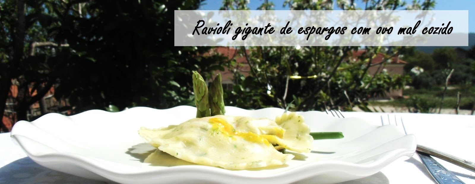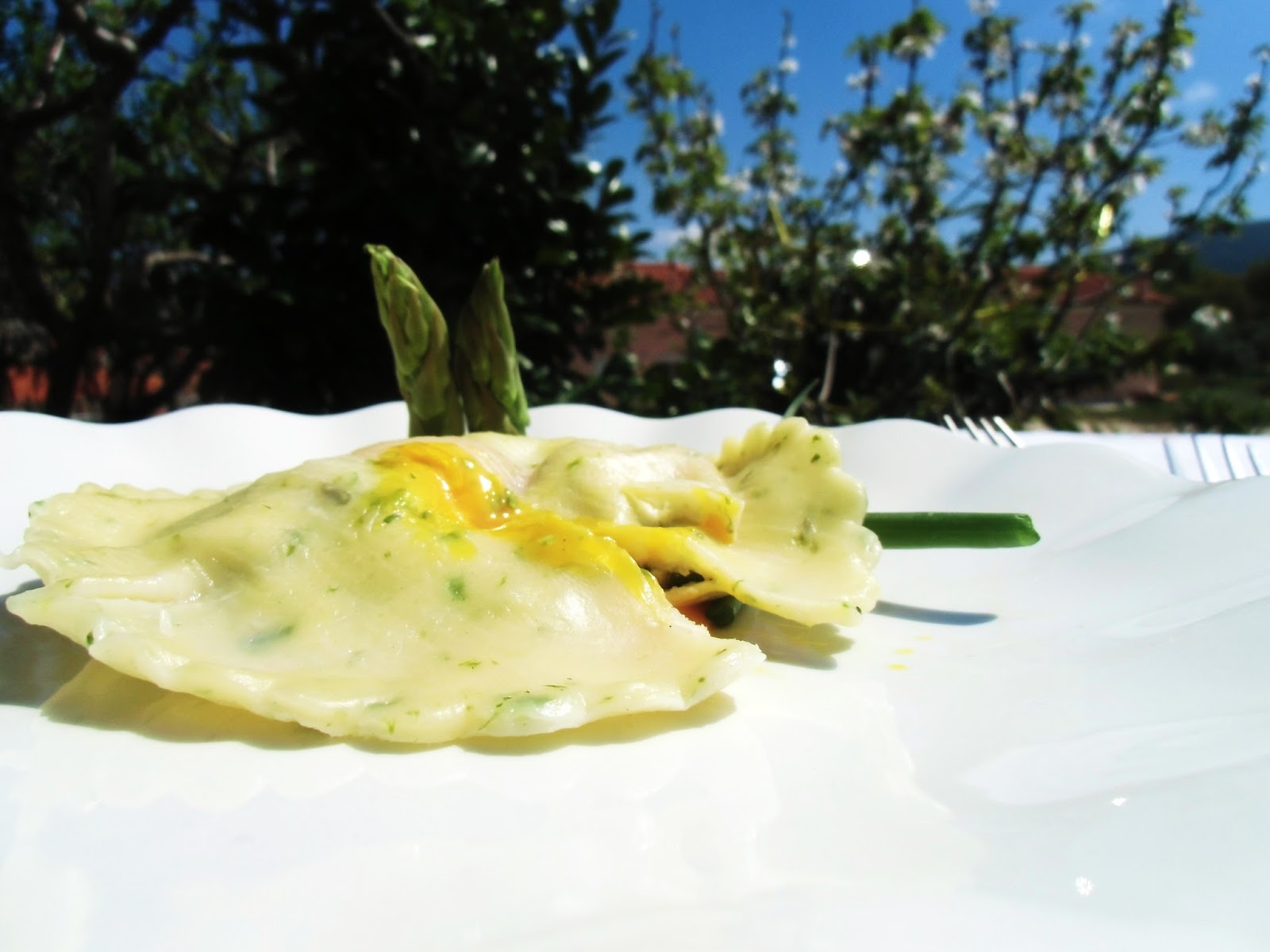 Ravioli gigante de espargos com ovo mal cozido